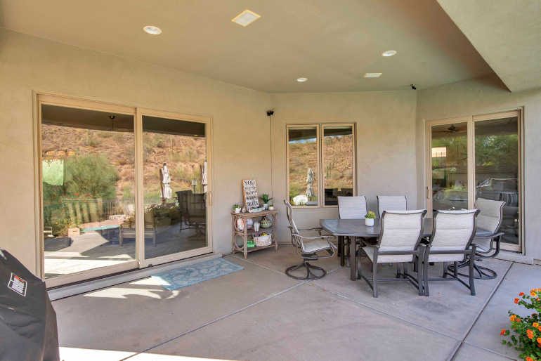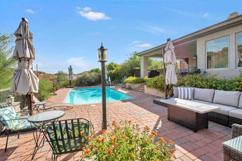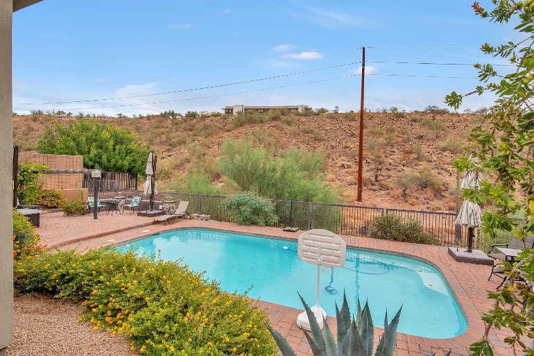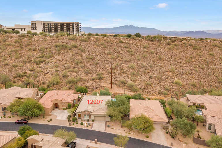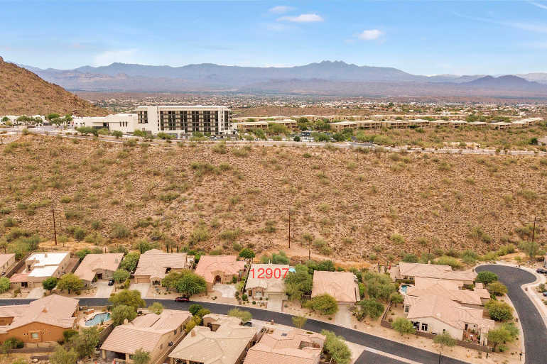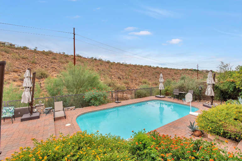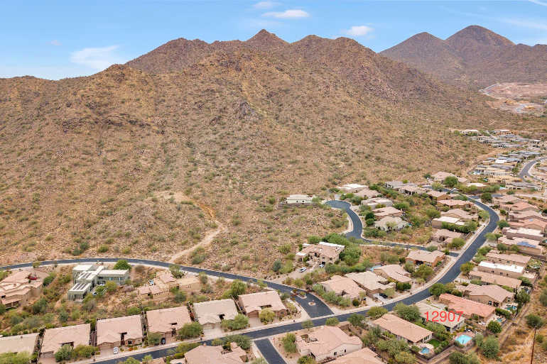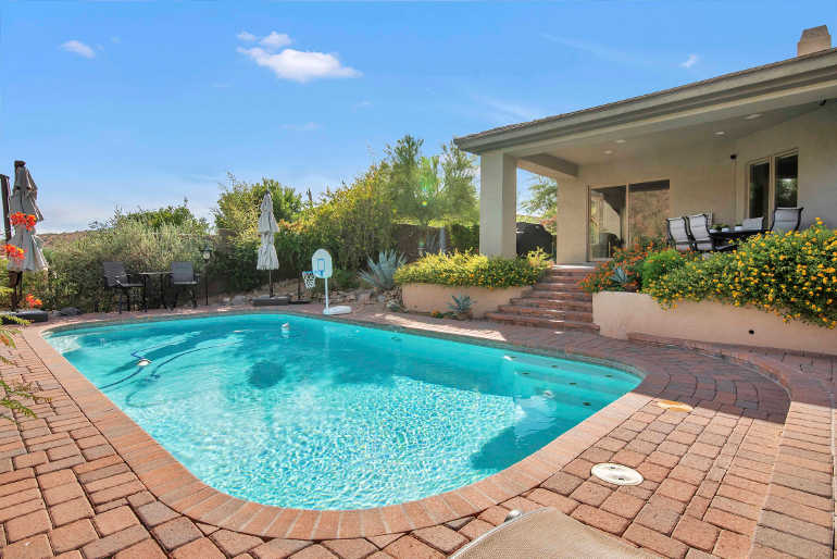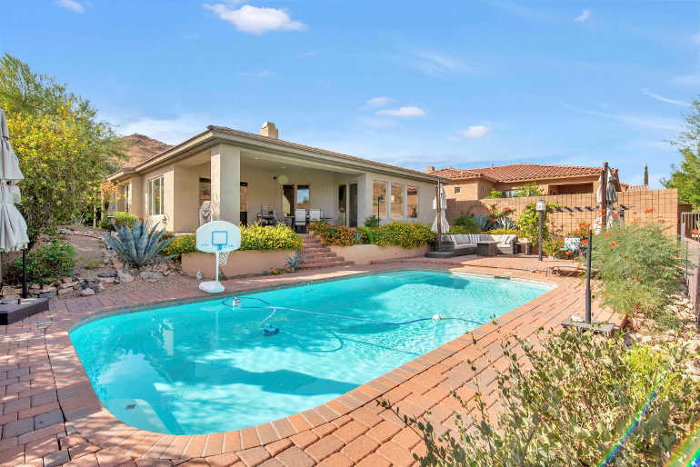 This residence is rich with upgrades (under Documents tab) and features, including Pella double paned windows, fantastic cooks kitchen open to family room, center island with breakfast bar, Corian countertops, kohler fixtures, 2 wall ovens, master bath with his/her vanities and custom closet, heated pool in private entertainer’s backyard with stunning mountain views, covered patio, all pavered decking, desert landscaping, front and back, for minimal maintenance and down the street from the Sunrise Trailhead.